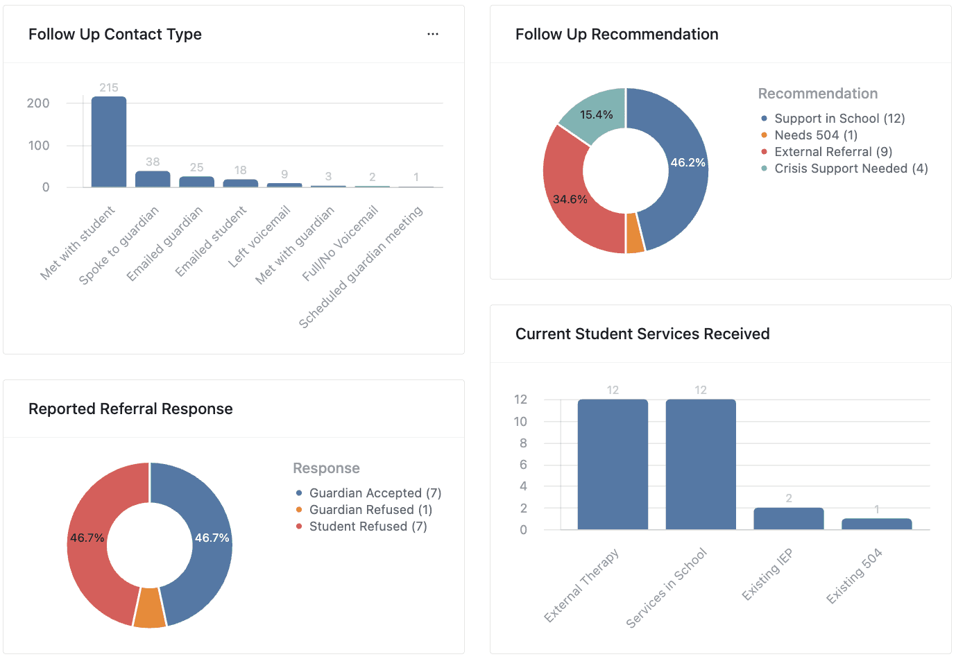 The charts below summarize follow-up actions and current supports for students flagged for concern. Most follow-up contacts occurred directly with students, with school-based support and external referrals being the most common recommendations. While guardians generally accepted referrals, students declined an equal number of referrals. Additionally, many students were already receiving external therapy or in-school services.
