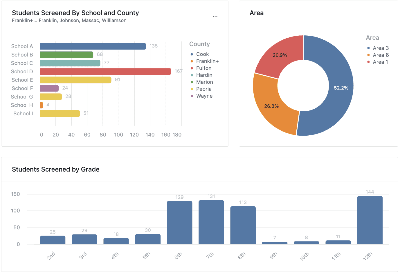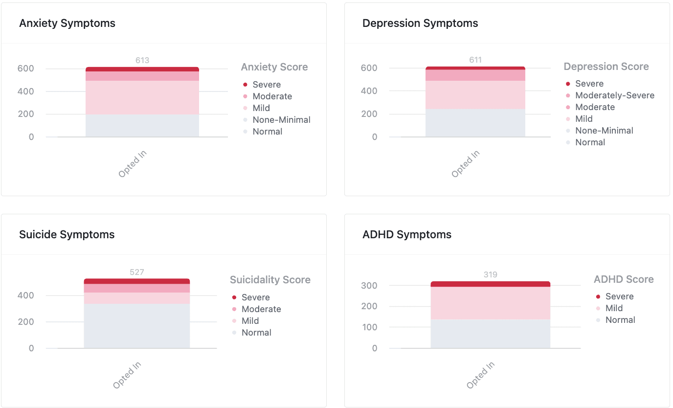 These charts show the distribution of symptom severity across all students screened with valid screening scores. Each bar is broken down by severity levels (e.g., mild, moderate, severe), showing how symptoms present across the student population.