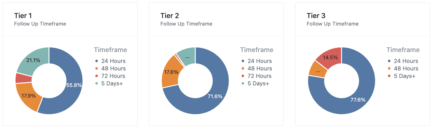 Across all tiers for all students, most follow-ups occurred within 24 hours, especially in Tier 3 (78%) and Tier 2 (72%), indicating a strong response for higher-risk students.